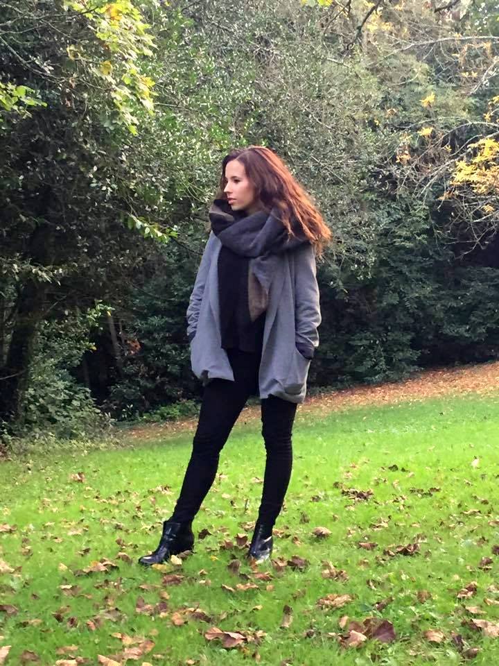 Un pull de couleur foncée enfilé sous la cape réchauffe la tenue. On adore cette allure de petit chaperon gris de la ville.