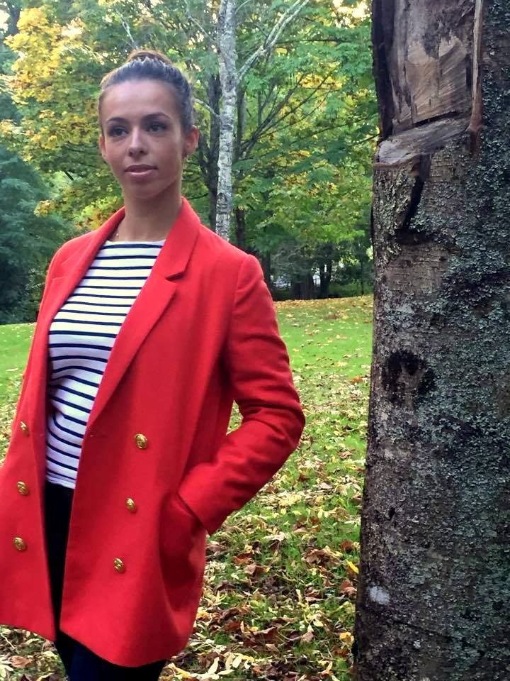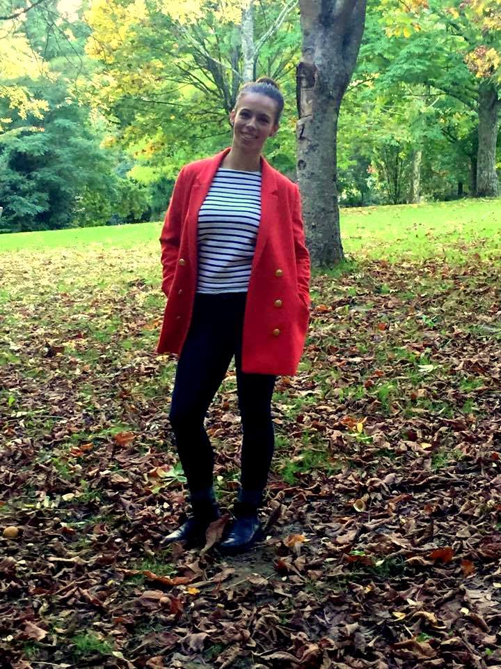 Un peu de couleurs dans cet automne gris. On aime l’allure marine de cette tenue avec la veste orange aux boutons dorés.
