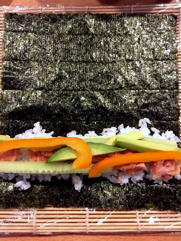 Puis disposer la feuille d’algue ainsi que le riz et toutes les garnitures désirées.