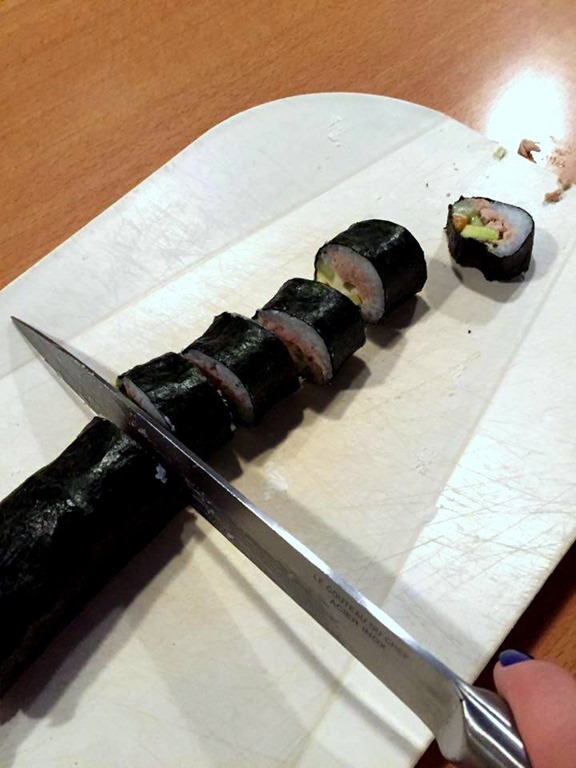 Laisser les makis entiers au réfrigérateur quelques instants afin qu’il soit plus facile de les couper.