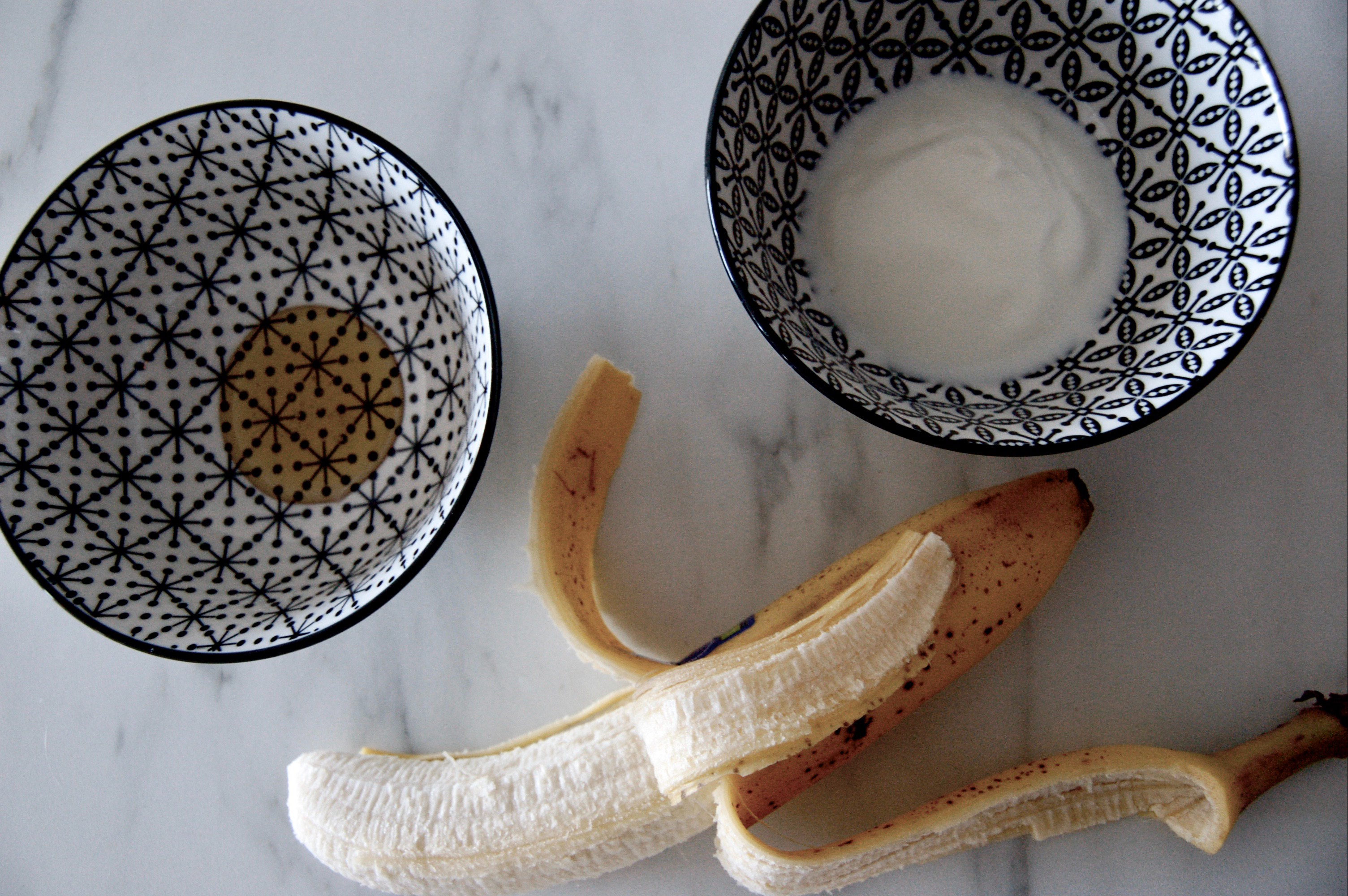 ✔︎ On coupe grossièrement la banane que l’on met dans le bol, puis on l’écrase avec la fourchette, on ajoute le yaourt puis le miel, on mélange bien pour avoir une texture assez épaisse. S’il reste des morceaux de banane ce n’est pas grave !