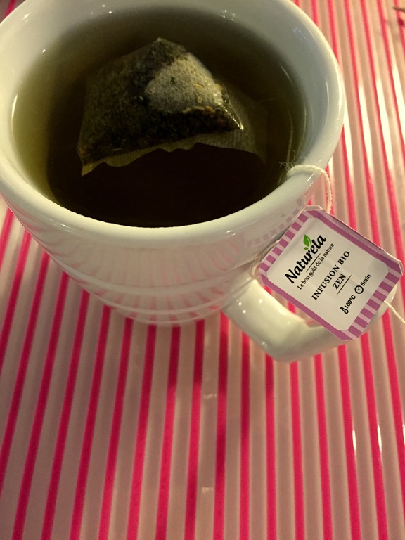 Je déguste une petite soupe de légumes, et je bois ma tisane Skinny Mint (ou une tisane Zen).
